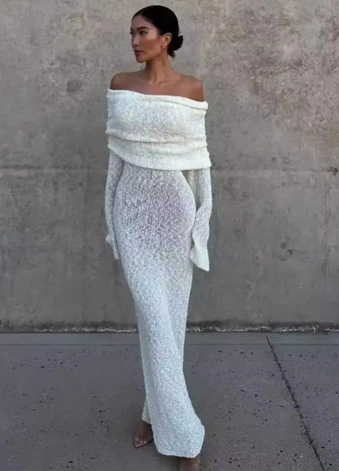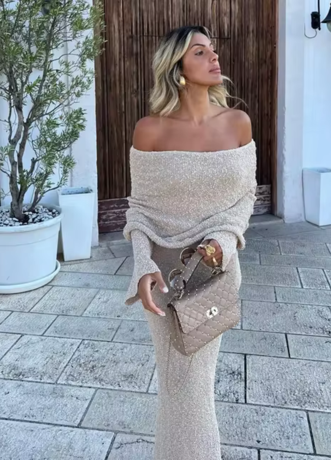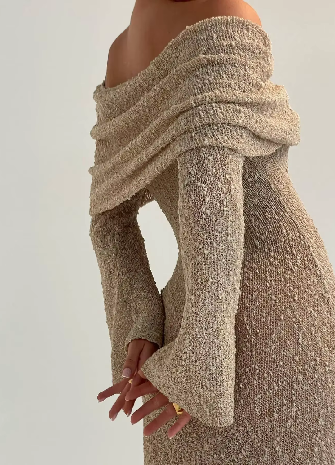 Elara™ Klänning kombinerar en feminin silhuett med en stilren, avslappnad look. Off-shoulder-urringningen framhäver dina axlar och nyckelben, medan det mjuka, lena tyget elegant omsluter din figur och skapar en smickrande passform.
